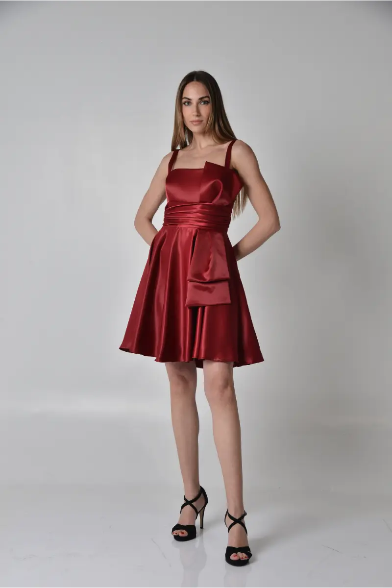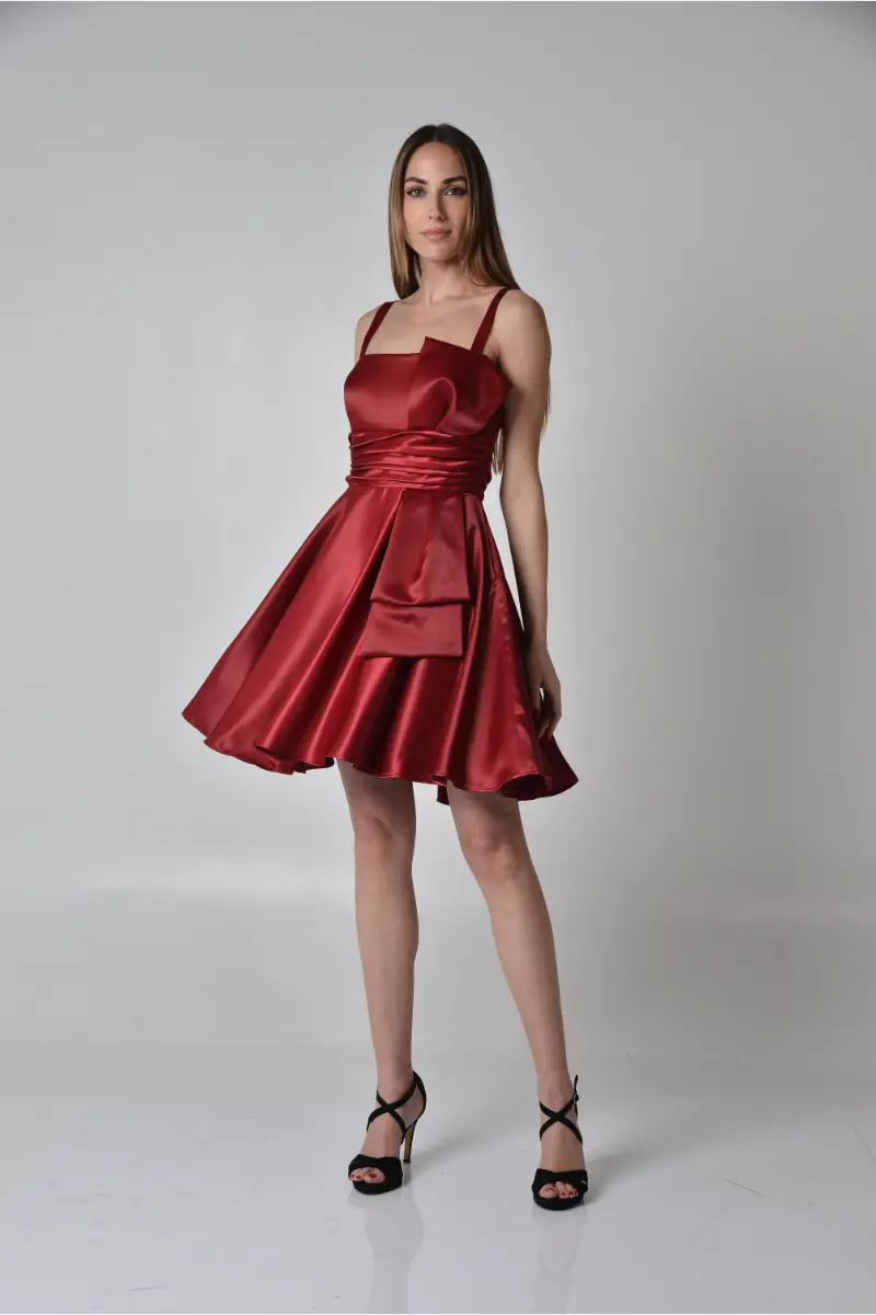 Εντυπωσιακό μίνι φόρεμα σε στράπλες γραμμή, διακοσμημένο με έναν εντυπωσιακό φιόγκο στο μπροστινό μέρος. Η ντραπέ εφαρμογή στη μέση αγκαλιάζει τη σιλουέτα, ενώ η φαρδιά φούστα από πολυτελές σατέν ρασμίρ χαρίζει κίνηση και κομψότητα. Ιδανικό για βραδινές εμφανίσεις που μαγνητίζουν τα βλέμματα.