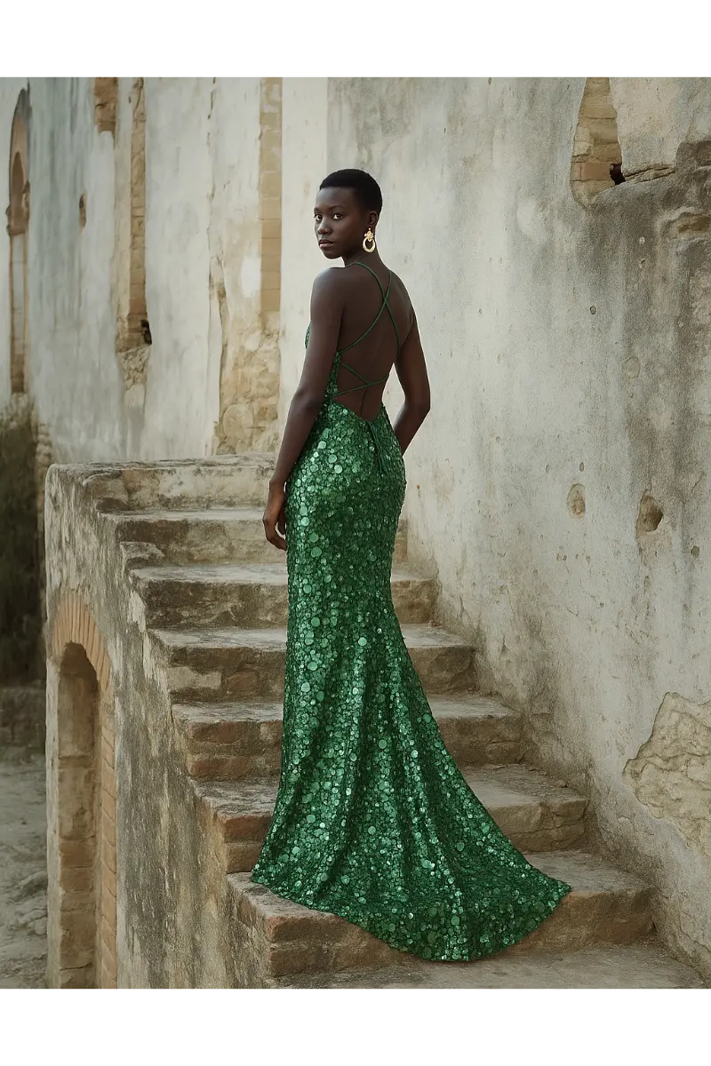 Μάξι βραδινό φόρεμα με αριστοκρατική ουρά που αποπνέει κομψότητα και φινέτσα. Η χαμηλή, ανοιχτή πλάτη του, δεμένη με χιαστί κορδόνια, αναδεικνύει τη θηλυκότητα, ενώ παράλληλα εξασφαλίζει τέλεια εφαρμογή. Το εκθαμβωτικό του ύφασμα, από δαντέλα κεντημένη με λαμπερές παγιέτες, αγκαλιάζει αρμονικά το σώμα, χαρίζοντας λάμψη σε κάθε σας κίνηση. Ένα μοναδικό κομμάτι, ιδανικό για γάμους και ιδιαίτερες περιστάσεις που απαιτούν αξεπέραστο στυλ και διαχρονική γοητεία.