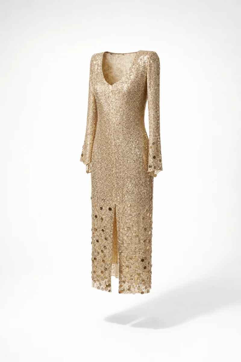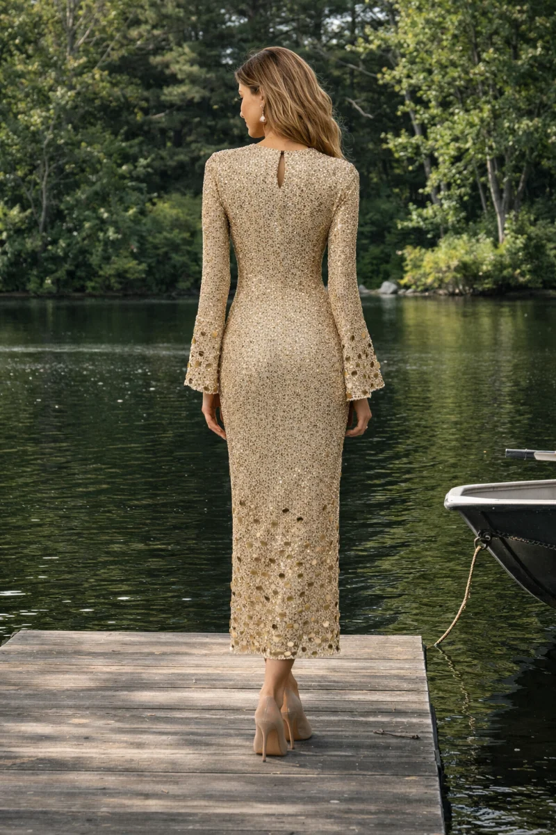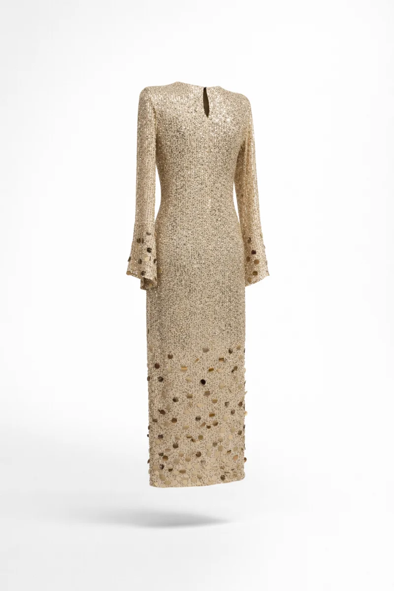 Φόρεμα για γάμο από κεντημένη παγιέτα με πούλιες, που χαρίζει εκλεπτυσμένη λάμψη • Σχεδιασμός σε ίσια γραμμή, που αγκαλιάζει τη σιλουέτα με κομψότητα • Μακριά μανίκια με εντυπωσιακά βολάν στο τελείωμα, για couture χαρακτήρα • Διακριτικό άνοιγμα στο κέντρο εμπρός, που προσθέτει θηλυκότητα • Ιδανικό για γάμο, επίσημη δεξίωση και black-tie εμφανίσεις