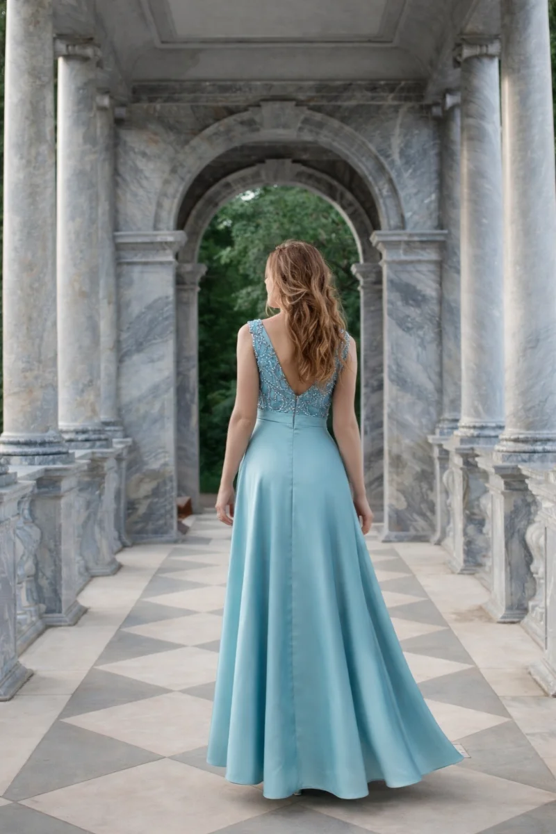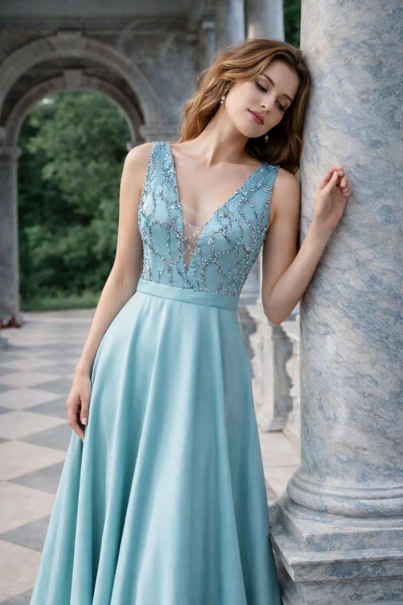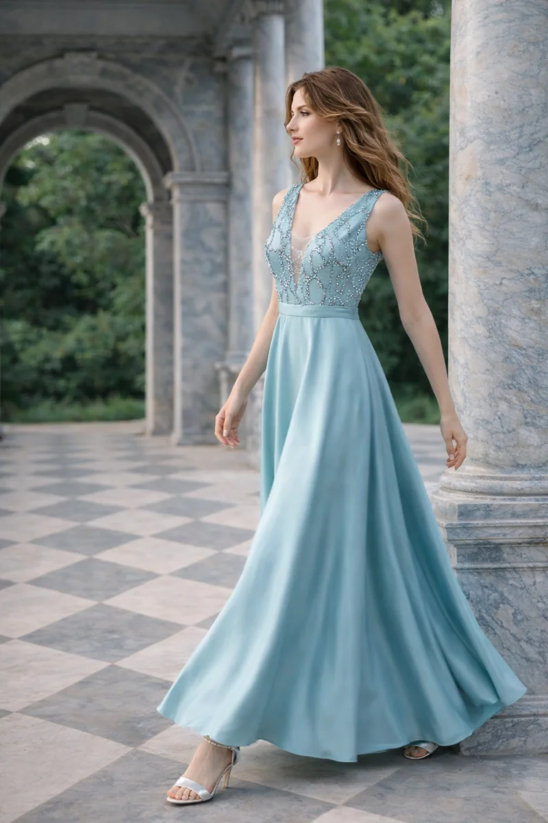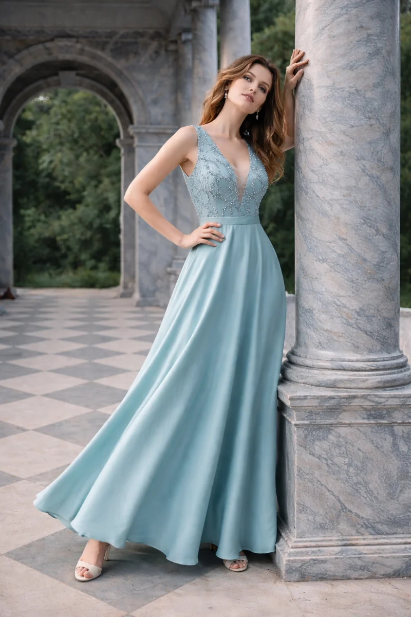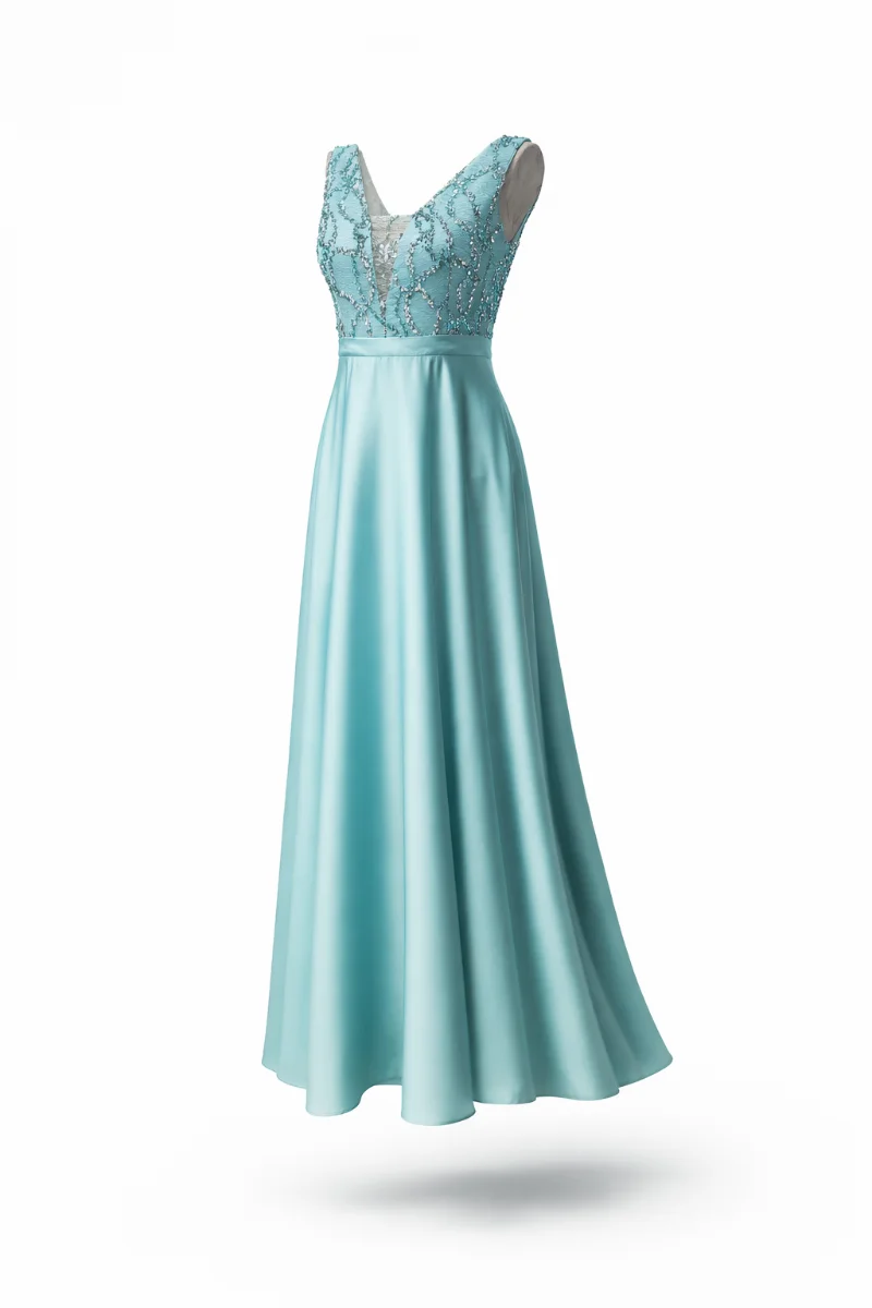 Φόρεμα για γάμο με διαχρονική κομψότητα • μπούστο σε V από φίνα κεντημένη δαντέλα διακριτική διαφάνεια που φωτίζει το ντεκολτέ χωρίς υπερβολή • φαρδιά σατέν φούστα με απαλή, ρευστή κίνηση • ισορροπία ανάμεσα σε ρομαντισμό και minimal αισθητική • άνετη εφαρμογή που κολακεύει κάθε σιλουέτα • ιδανικό για γάμο ή elegant βραδινή εμφάνιση