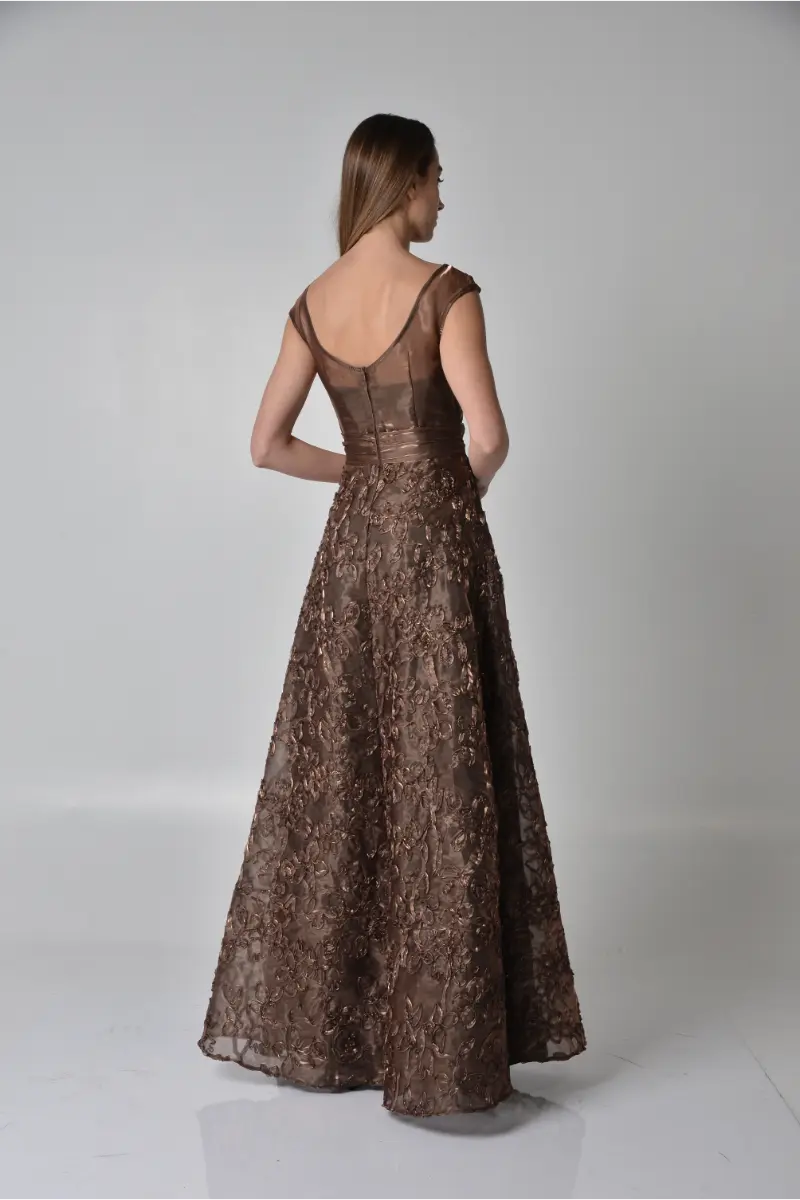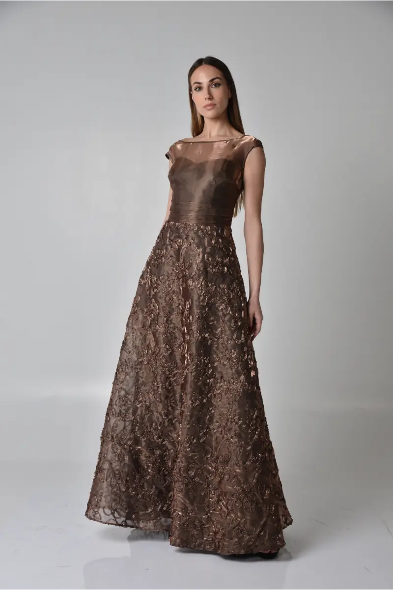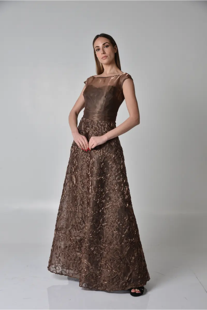 Αυτό το εντυπωσιακό βραδινό φόρεμα για γάμο ξεχωρίζει με το μπούστο χαμόγελο, που κατεβαίνει ελαφρώς στους ώμους, δημιουργώντας ένα διακριτικό μανικάκι από οργάντζα. Η φούστα σε Α γραμμή, επίσης από οργάντζα, είναι διακοσμημένη με ανάγλυφα λουλούδια, προσδίδοντας μια κομψή και ρομαντική αίσθηση. Ιδανική επιλογή για ιδιαίτερες περιστάσεις, που θα αναδείξει τη θηλυκότητα και την κομψότητά σας.