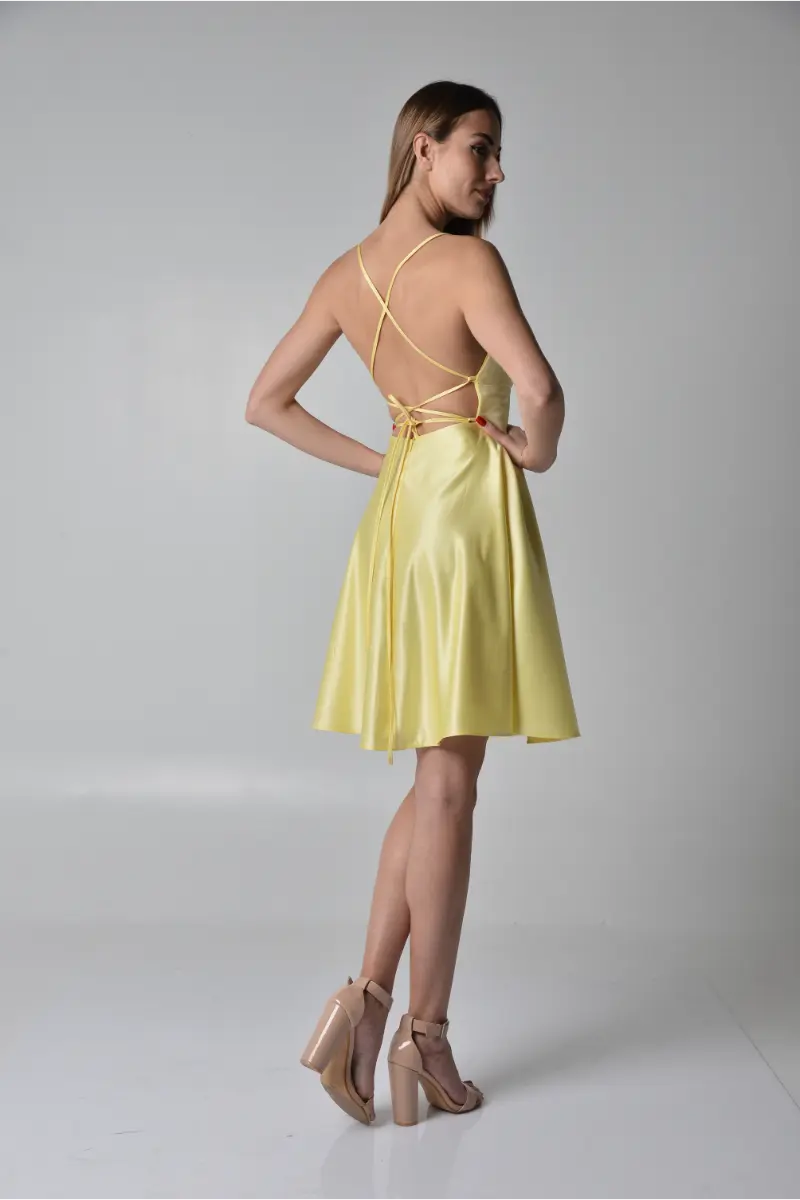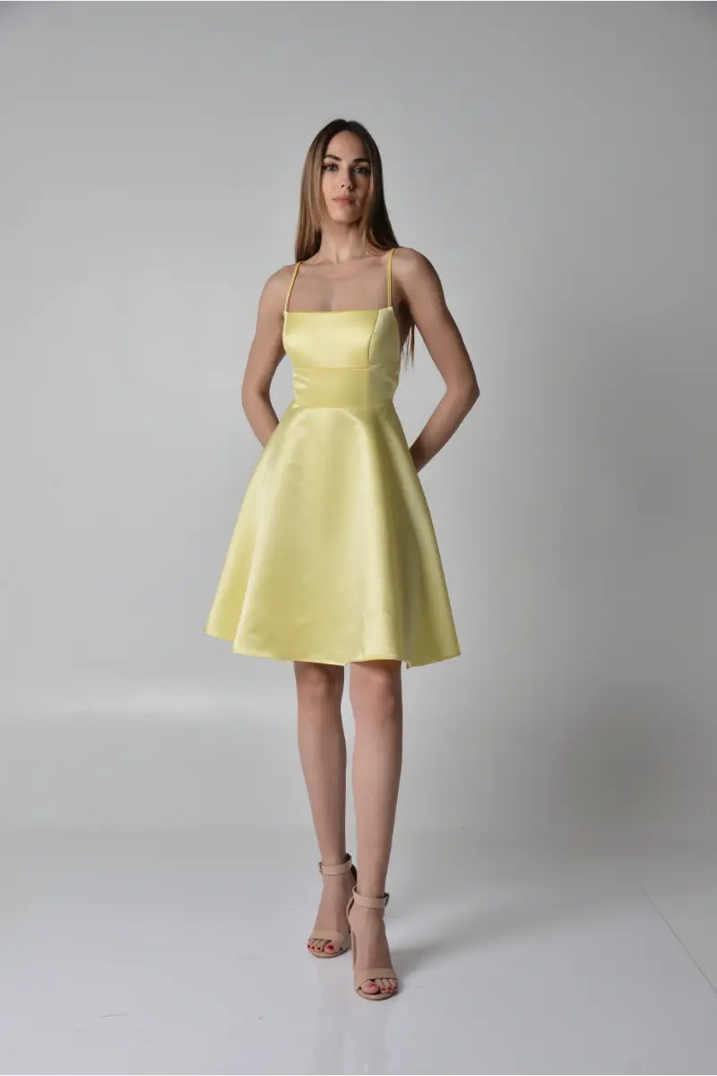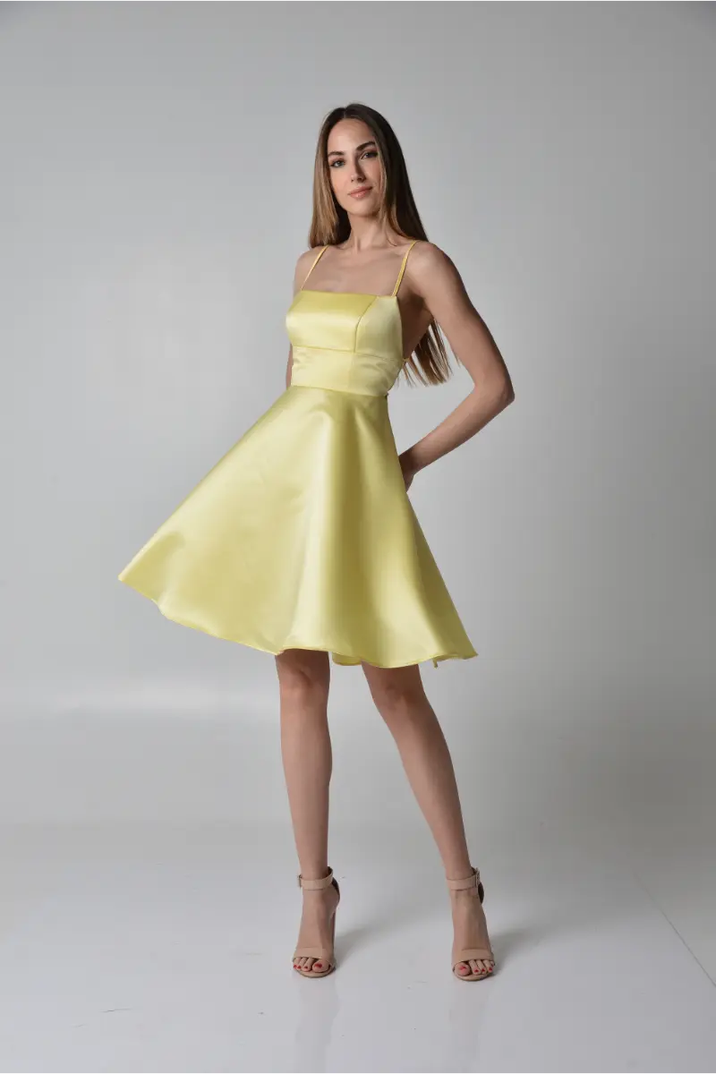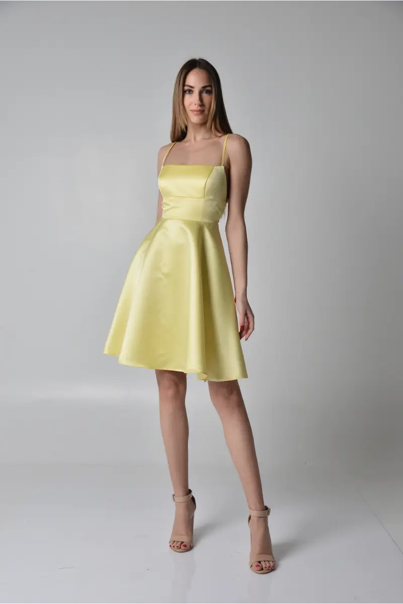 φόρεμα Μίνι strapless σατέν με φαρδιά φούστα και ενισχυμένο μπούστο σε στυλ κορσέ. Διαθέτει χαμηλή πλάτη με χιαστή τιράντες-κορδόνια για τέλεια εφαρμογή και κομψή εμφάνιση. Ιδανική επιλογή για ιδιαίτερες περιστάσεις!