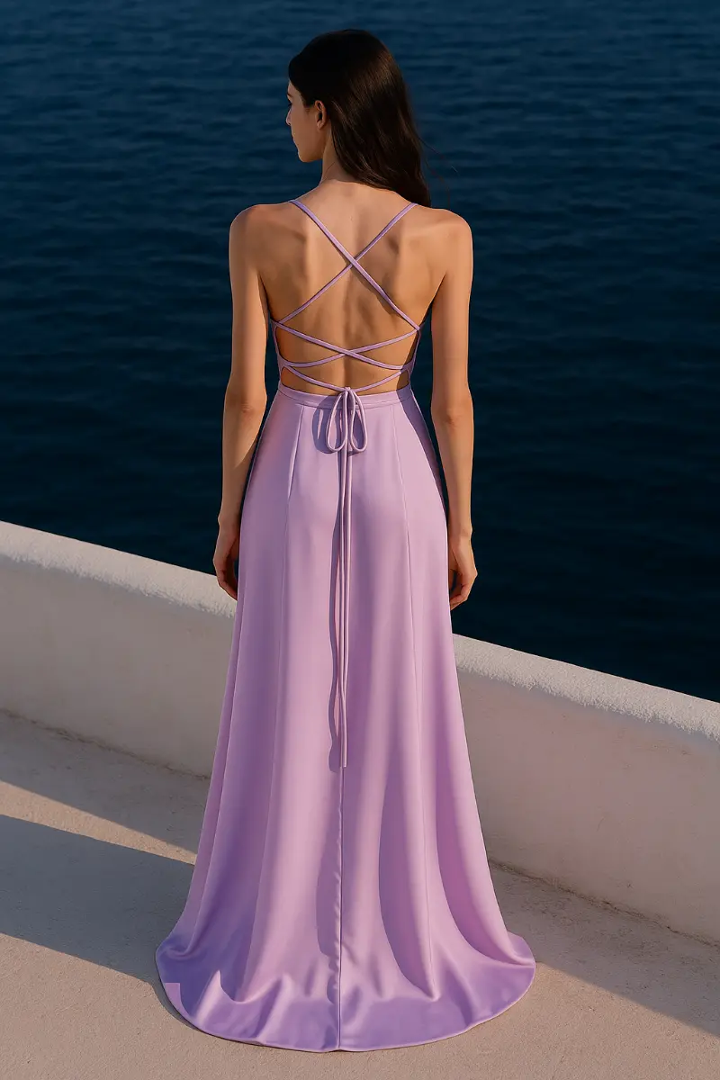 • λεπτές τιράντες και ανοιχτή πλάτη με χιαστί κορδόνια για κομψή στήριξη