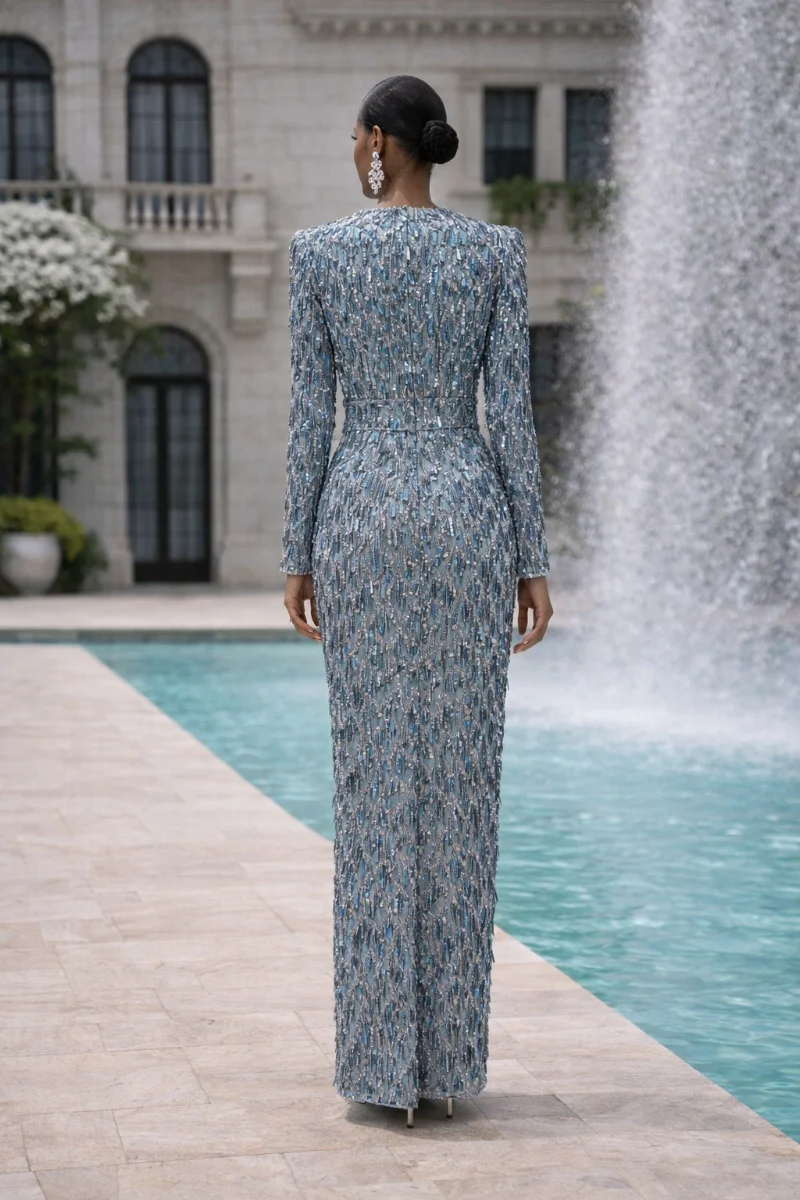 βραδινό φόρεμα από πολυτελές σατέν velvet ύφασμα με φίνα λάμψη • φούστα τύπου φάκελος που ανοίγει με κάθε κίνηση, χαρίζοντας αέρινη κομψότητα • σούρα στη μέση που αγκαλιάζει αρμονικά το σώμα • φαρδιά μπασκιά σε σχήμα πυραμίδας, στολισμένη με διακριτικό ρέλι glitter που προσθέτει λάμψη σε κάθε βήμα • μπούστο με μαλακές σούρες που δένει αισθησιακά γύρω από τον λαιμό, αναδεικνύοντας το ντεκολτέ • εντυπωσιακή ανοιχτή πλάτη που αποπνέει θηλυκότητα και φινέτσα • ένα φόρεμα σχεδιασμένο για τη γυναίκα που δεν ακολουθεί απλώς τη μόδα — τη δημιουργεί, με αυτοπεποίθηση και εκλεπτυσμένη λάμψη
