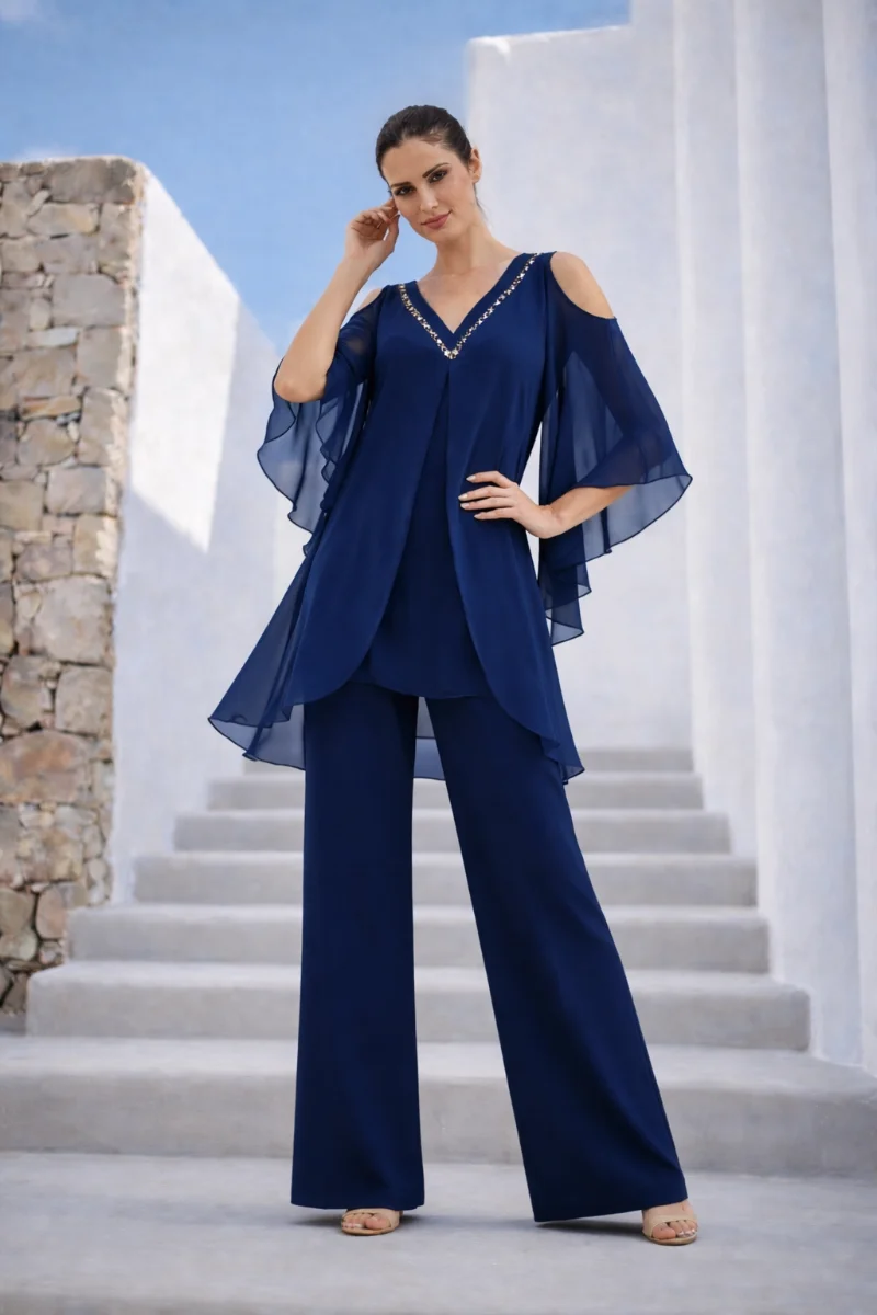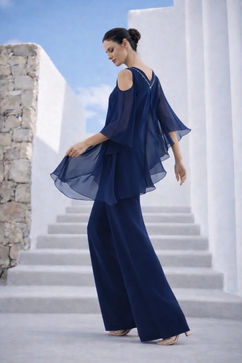 Ντεπιές από αέρινη μουσελίνα • ιδανικό για τις plus size φίλες μας • μπλούζα με ντεκολτέ σε σχήμα V • διακριτικό άνοιγμα στους ώμους • στολισμός με γκλίτερ στο V • παντελόνι σε φαρδιά, άνετη γραμμή • κομψή εφαρμογή που κολακεύει τη σιλουέτα.