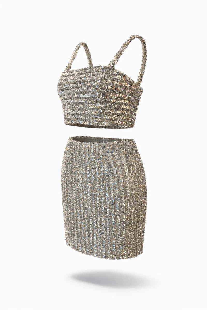 Ντεπιές σετ εντυπωσιακό • μπούστο crop top • strapless με τιράντες • φούστα μίνι • χαμηλομέση εφαρμογή • από ασημί παγιέτα • έντονη λάμψη με βραδινό χαρακτήρα • αναδεικνύει τη σιλουέτα • ιδανικό για parties & night outings.