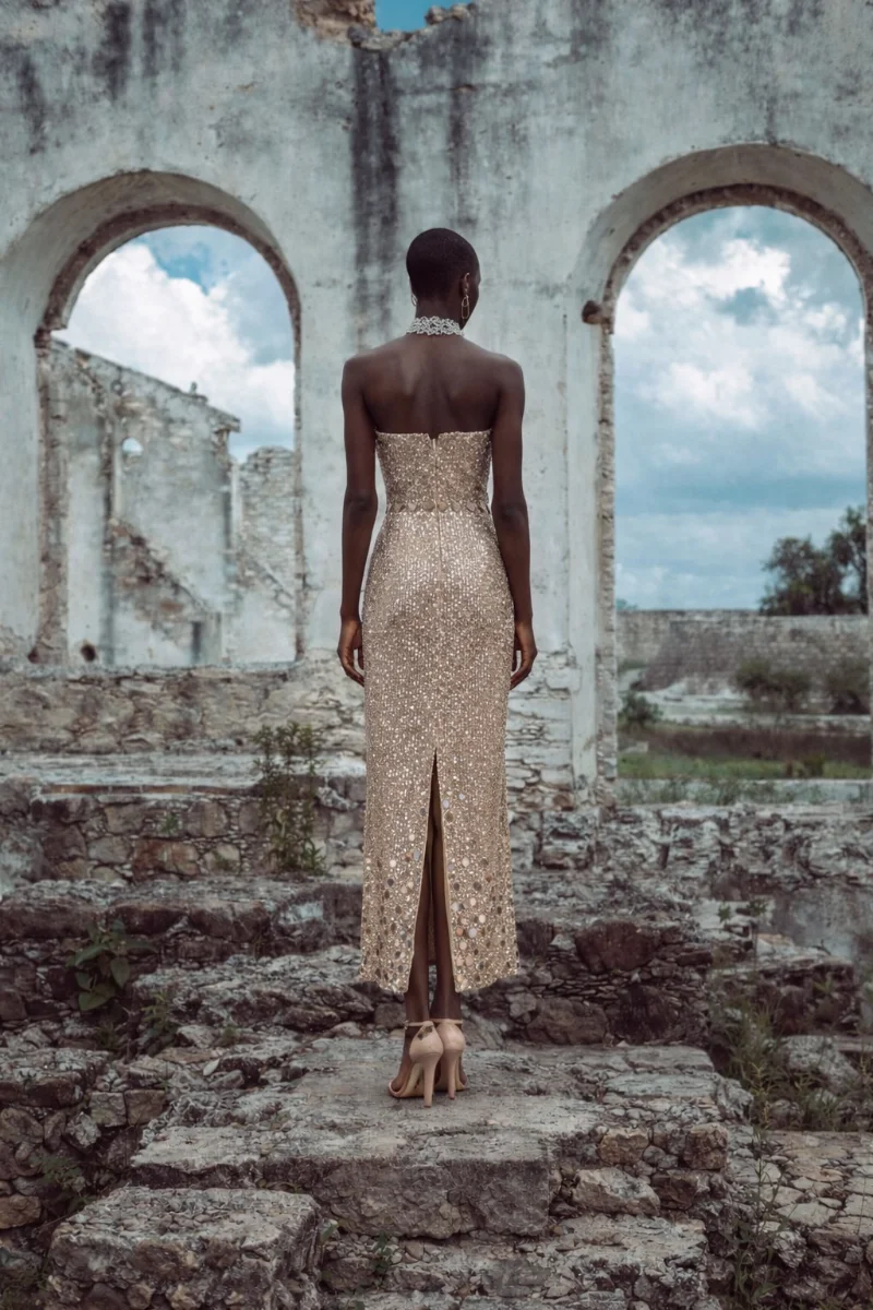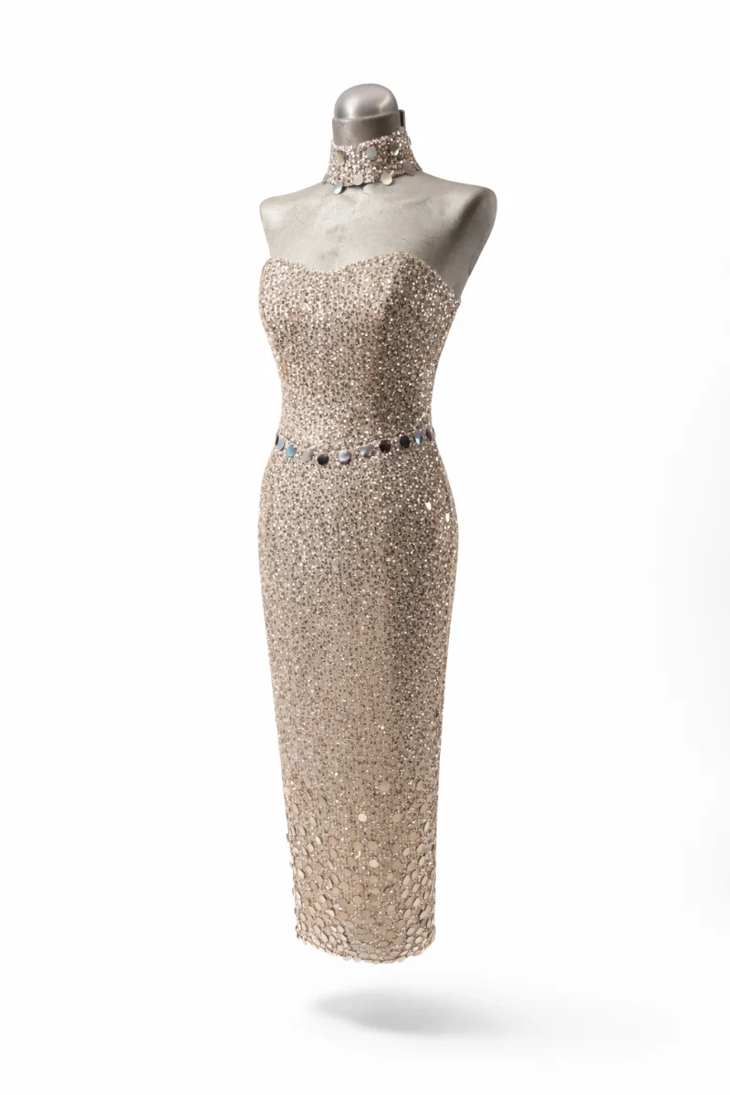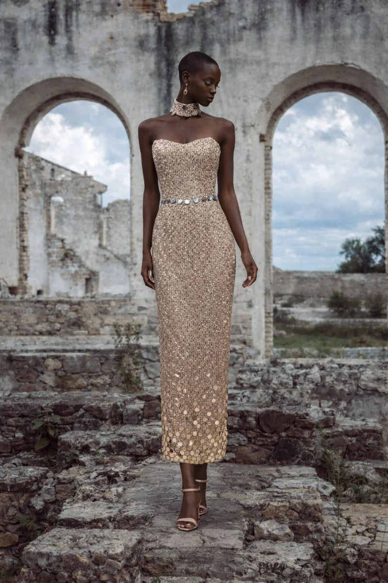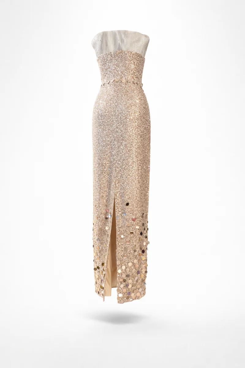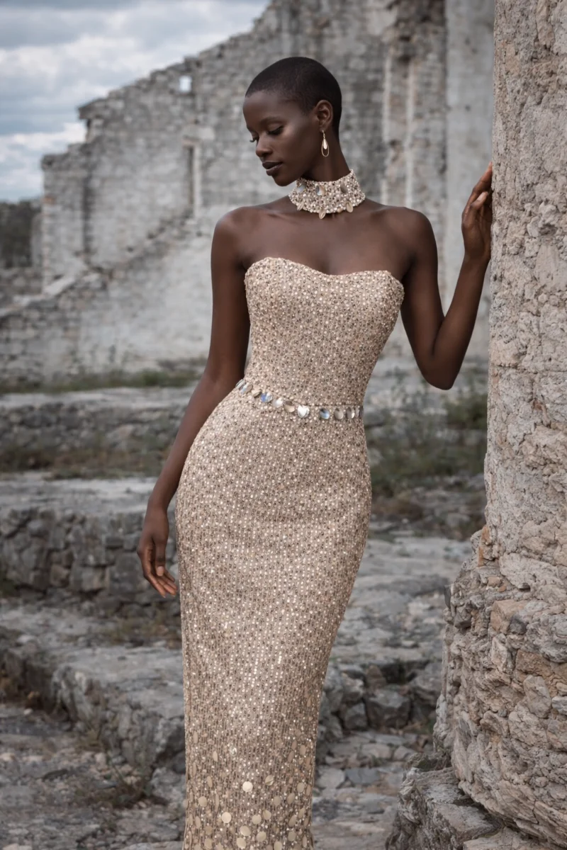 Φόρεμα για γάμο με έντονη couture αισθητική • Ιδιαίτερο ύφασμα από παγιέτα με κεντημένες πούλιες που χαρίζουν εκλεπτυσμένη λάμψη • Strapless σχέδιο που αναδεικνύει τους ώμους και το ντεκολτέ • Στρογγυλεμένο κατέβασμα στη μέση για άψογη εφαρμογή και θηλυκή γραμμή • Φούστα σε ίσια γραμμή που τονίζει τη σιλουέτα • Άνοιγμα στο κέντρο πίσω για άνεση στην κίνηση και διακριτική αισθησιακή λεπτομέρεια • Τζόκερ από το ίδιο ύφασμα που ολοκληρώνει το look με μοντέρνα πολυτέλεια • Ιδανικό για καλεσμένη σε γάμο ή επίσημο evening event