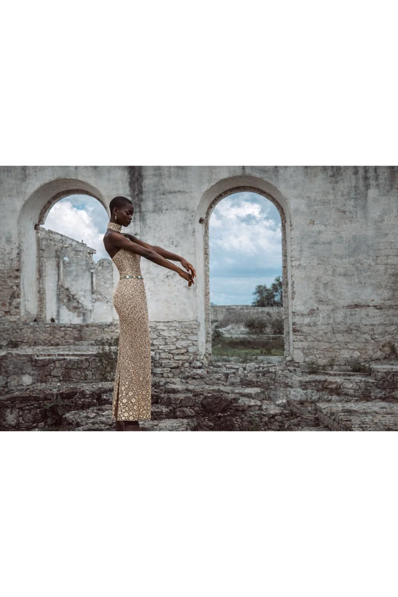 Εντυπωσιακό μάξι φόρεμα με σμόκιν γιακά, που αναδεικνύει τη θηλυκότητα με διακριτική αυστηρότητα • μακριά μανίκια από ανάλαφρη μουσελίνα, που χαρίζουν αέρινη κίνηση • δύο ανοίγματα μπροστά για κομψό και δυναμικό αποτέλεσμα • αποσπώμενη ζώνη με χρυσό φυτίλι στο επάνω μέρος, που τονίζει αρμονικά τη μέση • ιδανικό για βραδινές εμφανίσεις με elegant χαρακτήρα .